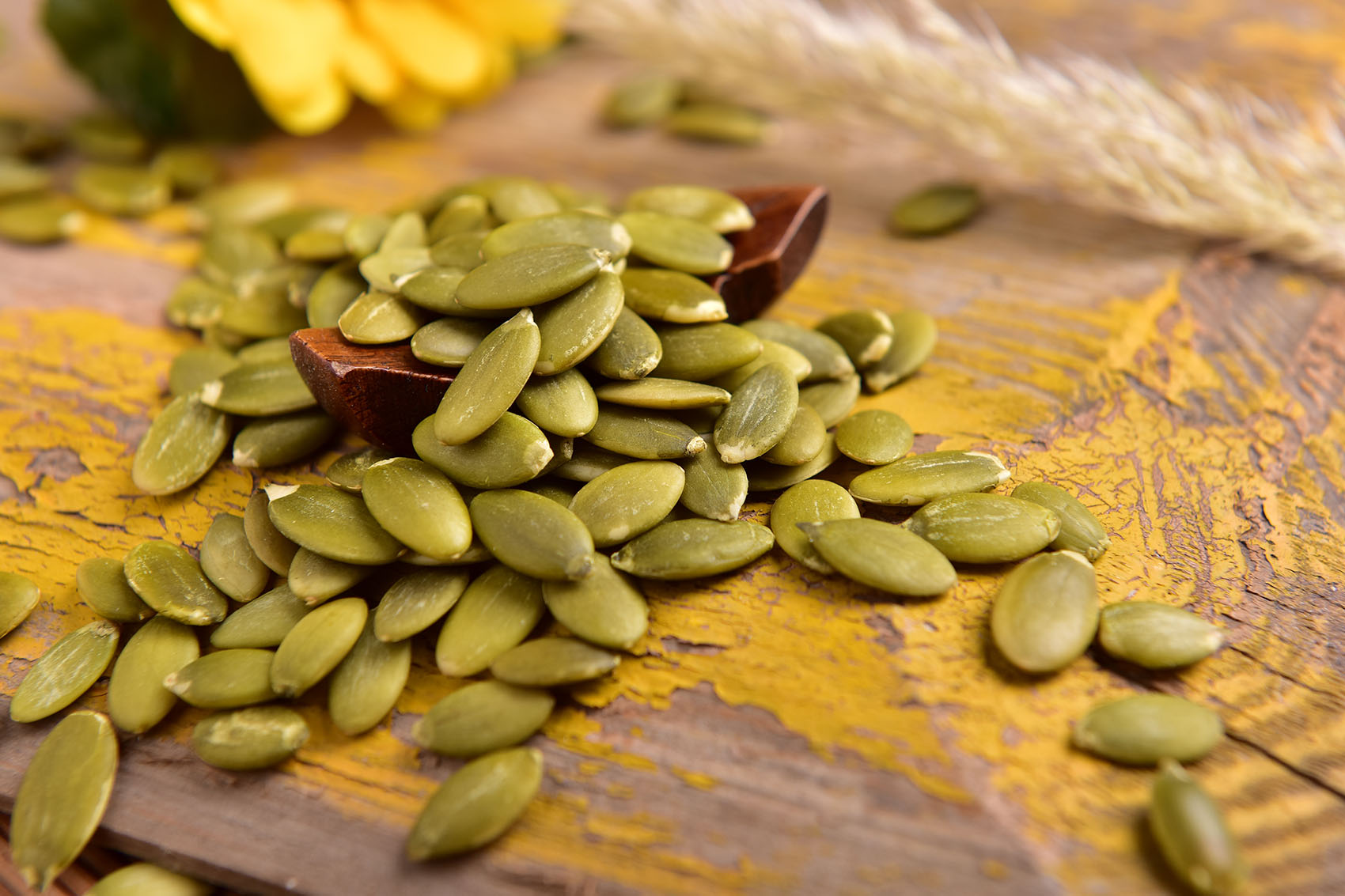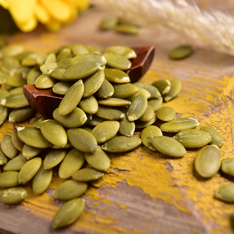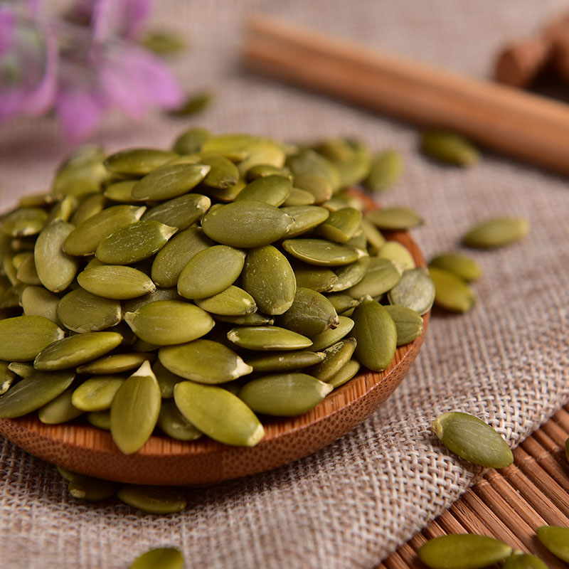 精選大顆粒南瓜籽進(jìn)行去殼加工,色澤呈墨綠色,顆粒大且均勻完整 南瓜籽仁AA級(jí)