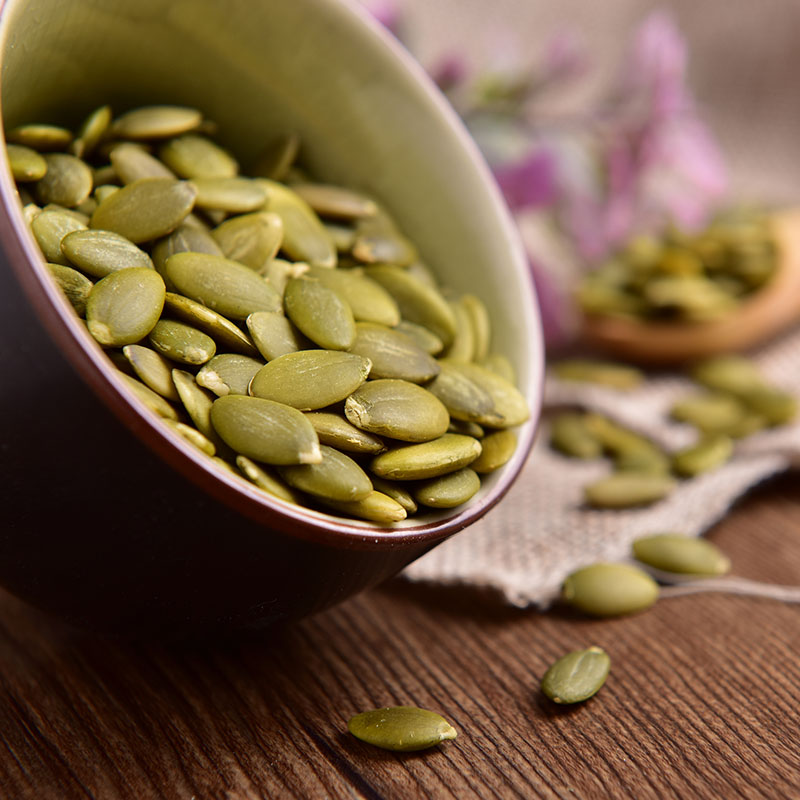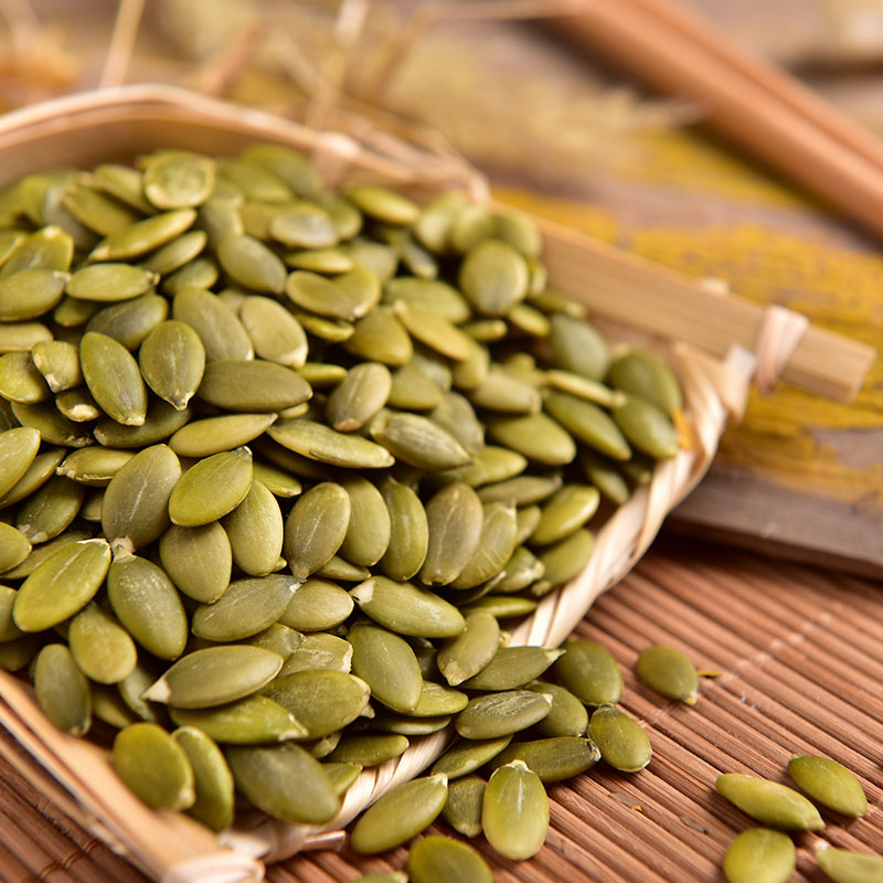 精選大顆粒南瓜籽進(jìn)行去殼加工,色澤呈墨綠色,顆粒大且均勻完整 南瓜籽仁AA級(jí)